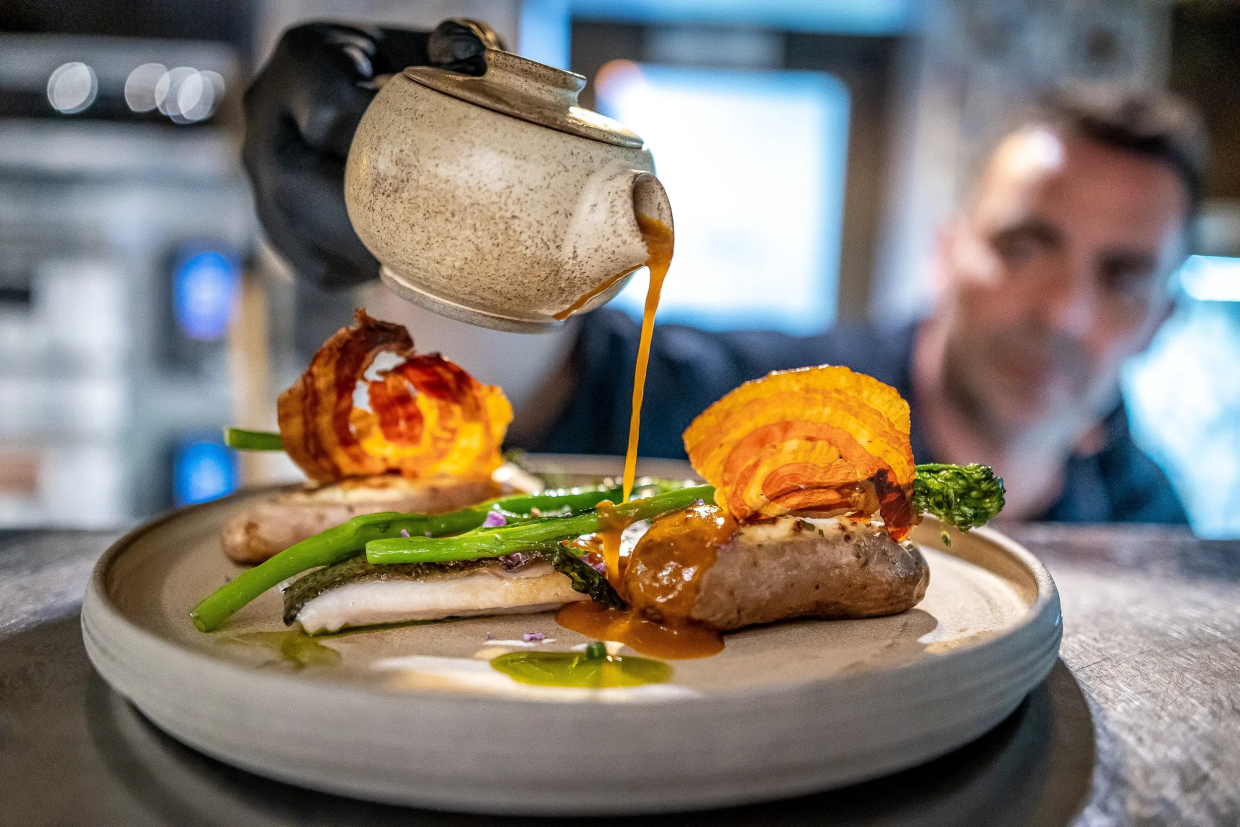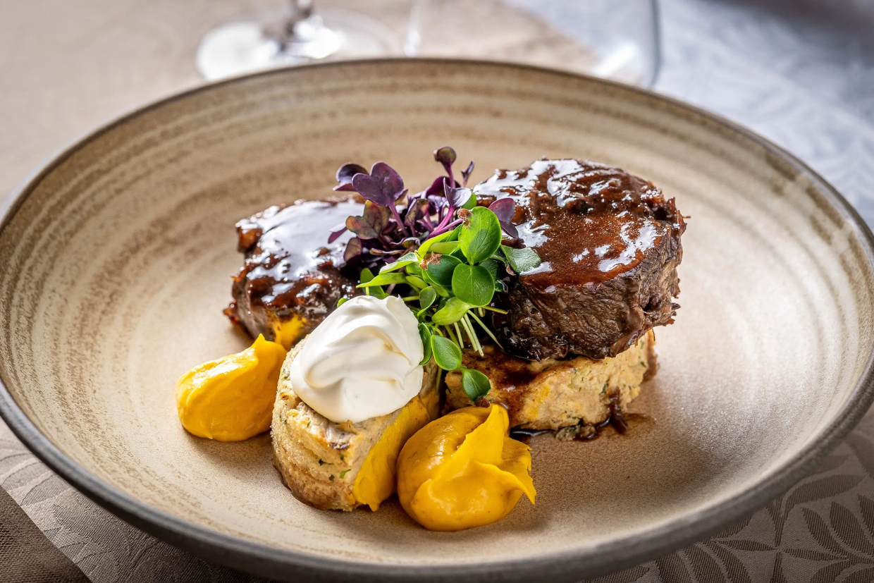 Orientačná cena za obed (predjedlo + hlavné jedlo + dezert) v reštaurácii Erhardt - 35 eur